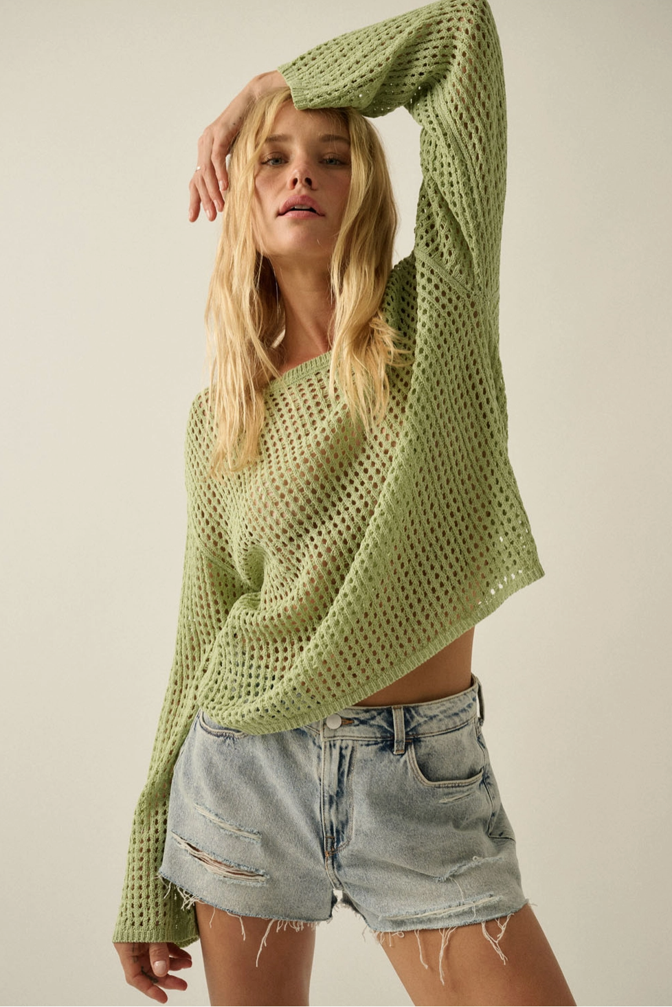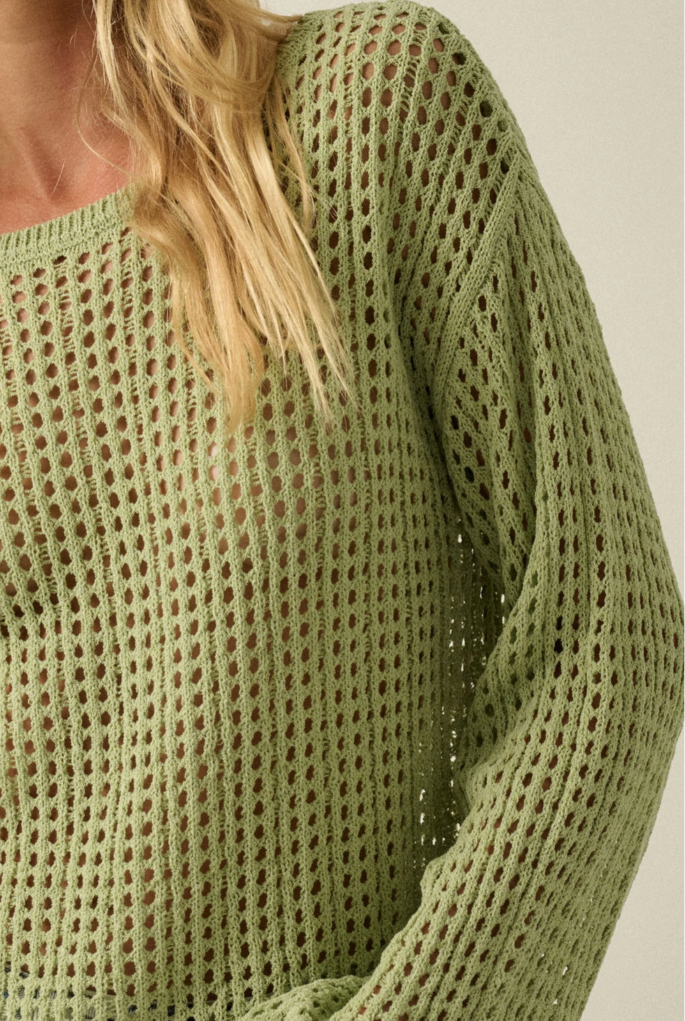 An open-knit crochet sweater with the following features: Boat neckline. Long sleeves. Drop shoulder. Ribbed knit neckline and cuffs. Unlined. Loose fit.