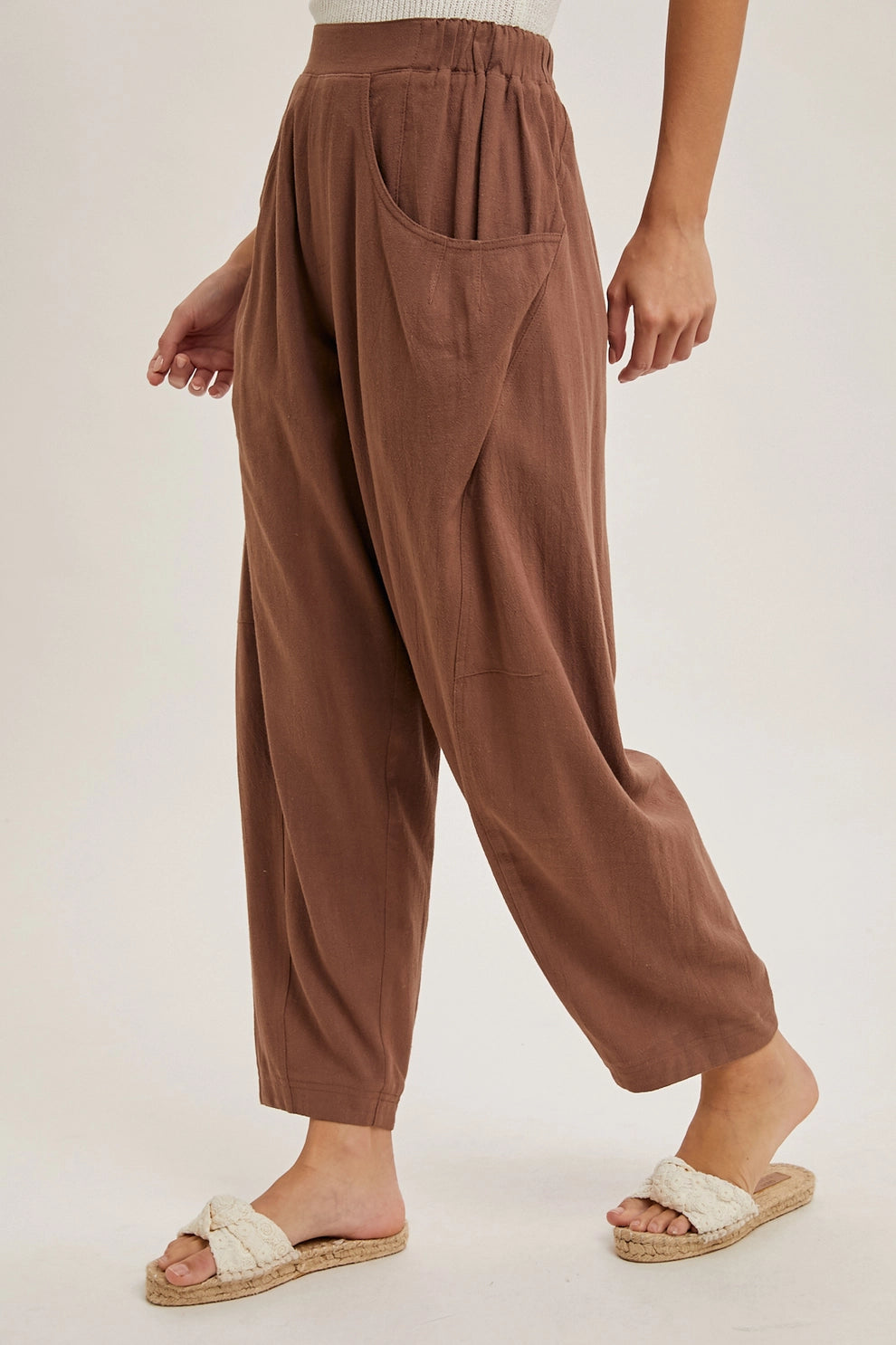 Relaxed barrel pants with pockets are a trendy and practical option for casual and comfortable wear. These pants feature a roomy, barrel-shaped fit that provides a relaxed silhouette, perfect for ease of movement and a laid-back style. The addition of pockets offers functionality, making them convenient for carrying essentials like your phone or keys. Made with lightweight, breathable fabric, these pants are versatile and can be dressed up with a blouse or kept casual with a simple tee or sweater, making them a great addition to any wardrobe.