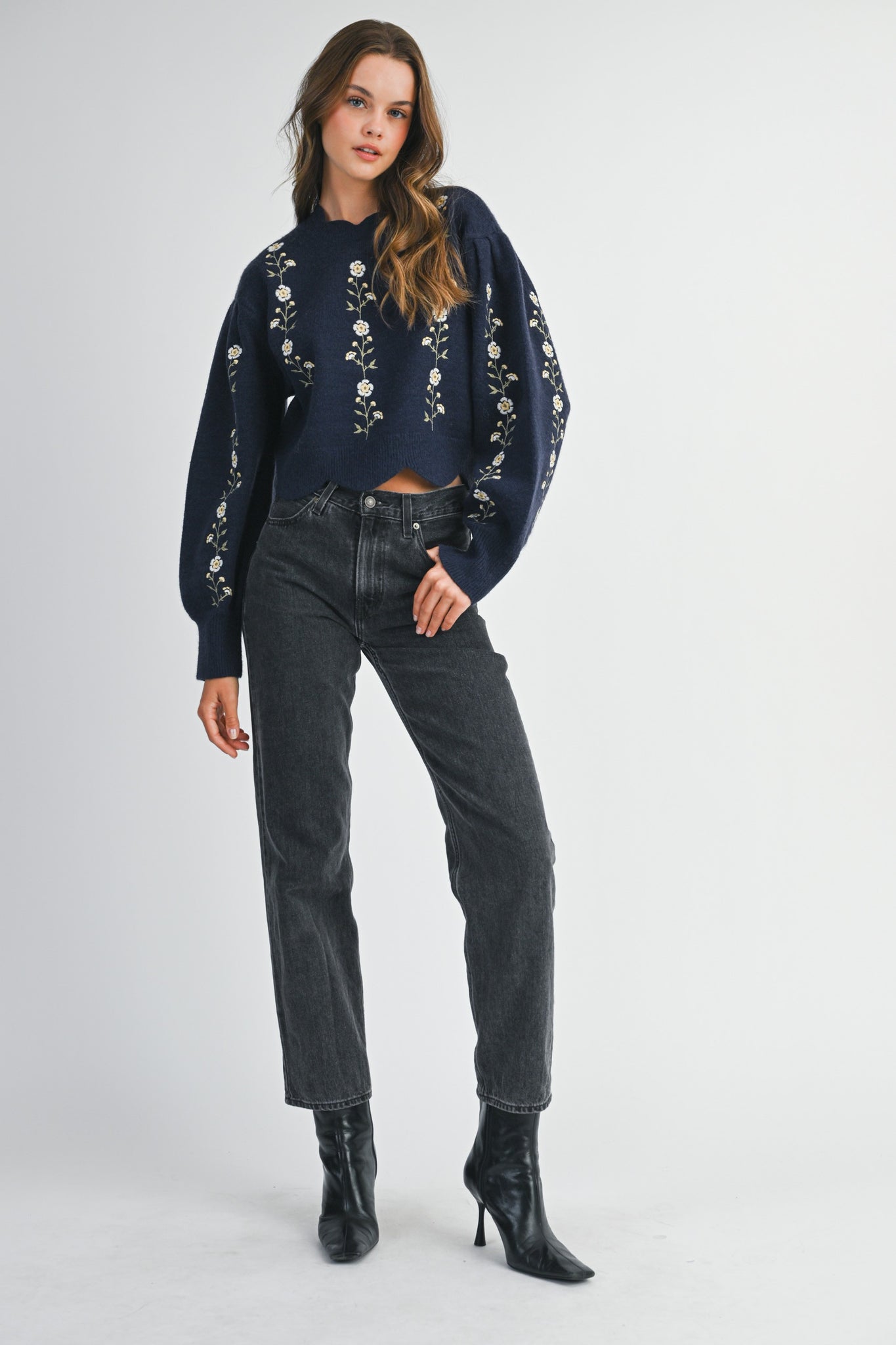 FLORAL EMBROIDERED SCALLOP SWEATER