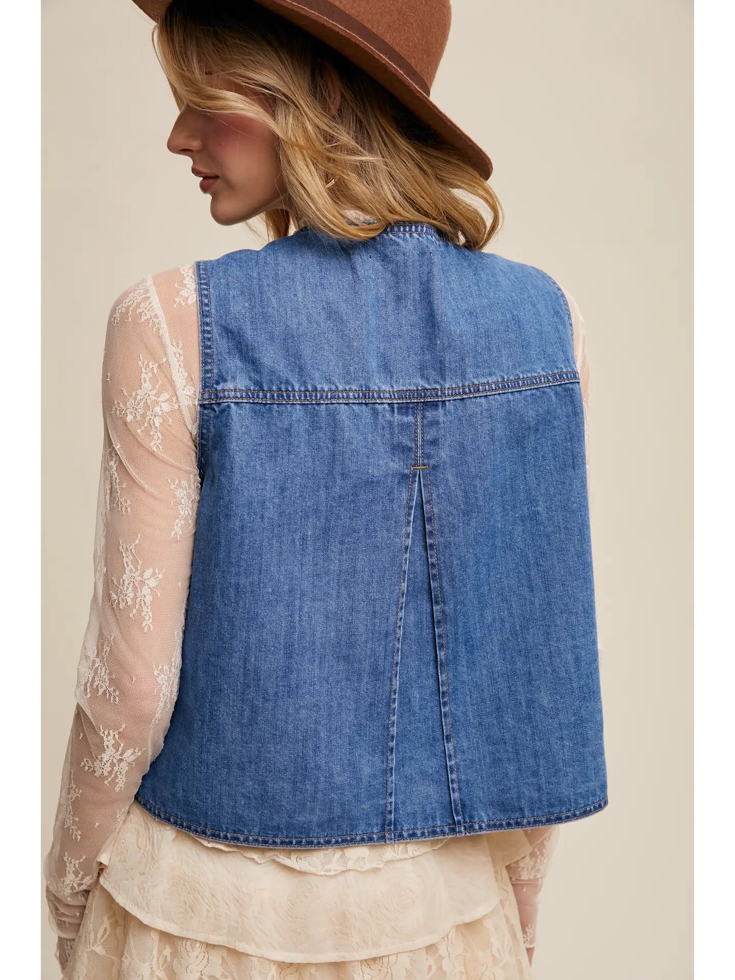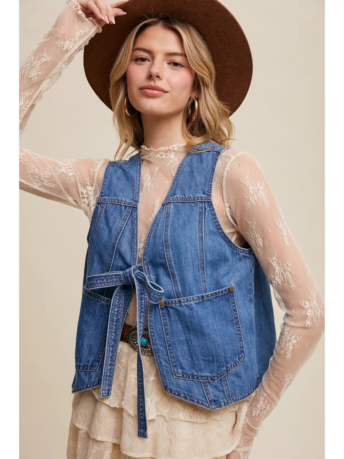 Timeless Denim Fabric: Crafted from durable yet soft denim, perfect for layering across seasons. - Tie-Front Closure: A stylish front-tie design adds a feminine touch and allows for a customizable fit. - Functional Front Pockets: Spacious pockets enhance both style and practicality, ideal for carrying small essentials. - Relaxed Fit: Designed with a slightly oversized silhouette for effortless layering and comfort. - Back Pleat Detail: Subtle pleat at the back ensures ease of movement and adds a polished finish.